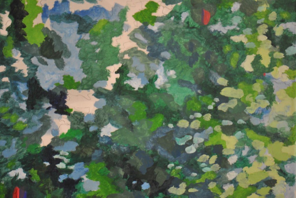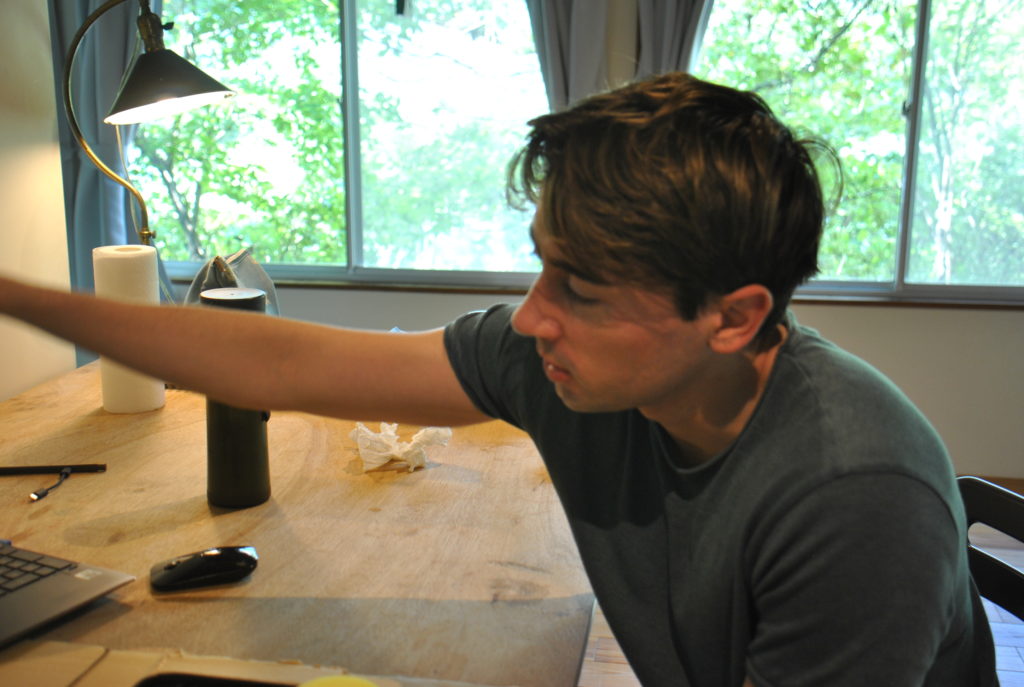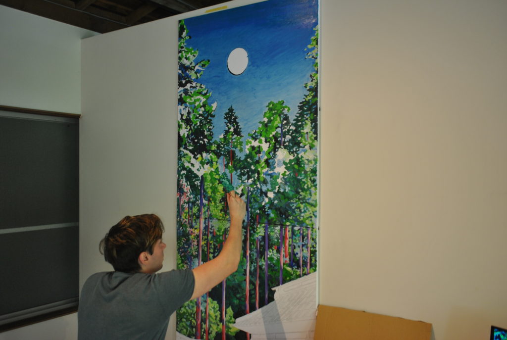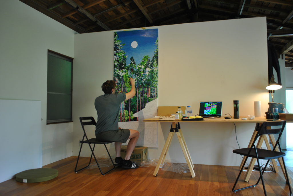 During his stay at SAIKONEON, Wilde immersed himself in the production of large-scale paintings. He spent the early part of the residency moving through the Lake Saiko area at an unhurried pace, relaxing and conducting research. Drawing from his observations and documentation of the surrounding landscape, he translated the region’s vast natural environment into his own vivid, colour-saturated motifs.